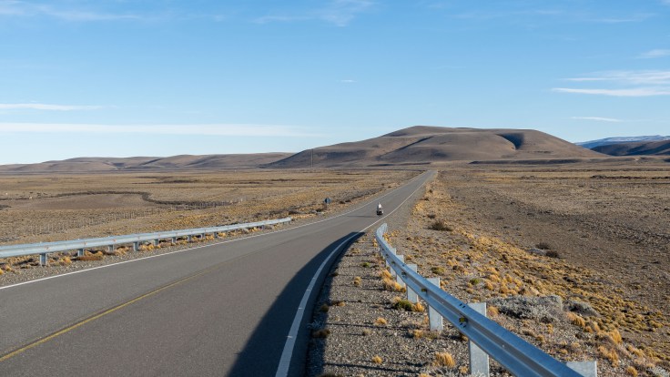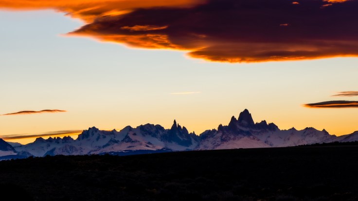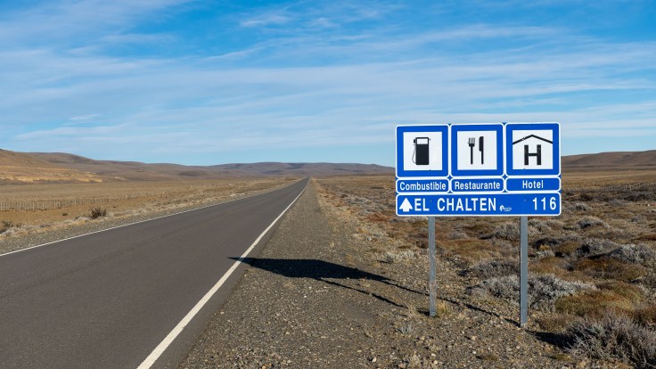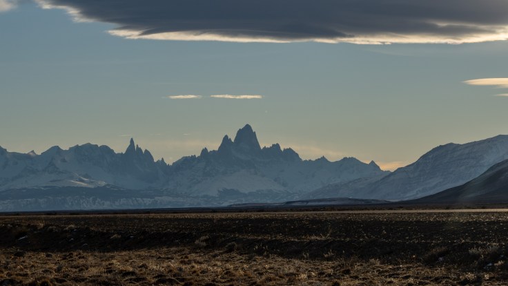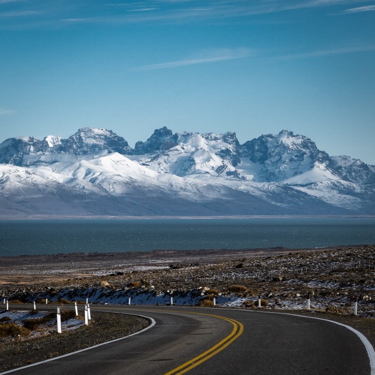 Une voiture nous croise sur 17km en 2h. Un gros trafic encore aujourd’hui. Une petite pause à midi de quelques gâteaux sucrés à terminer, sur le bord de route, nous fait du bien. On vérifie la route, enfin les kilomètres restants, car pour l’itinéraire, il n’y a pas d’autre choix que d’aller tout droit, de suivre le seul chemin dans ce paysage. Il oscille entre les collines, en légère pente positive, puis ose nous faire miroiter une blancheur qui culmine au-dessus de la crête beige. La Cordillère! La revoilà. Le Cerro Torre et le Fritz Roy sont visibles. La Cordillère plus au Sud avec ses glaciers, est couverte de neige et d’un léger voile nuageux. Le panorama est sublime. Nous l’attendions celui-là, depuis la France, comme un rêve de grimpeur et montagnard. Des lieux mythiques pour nous.