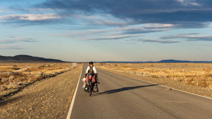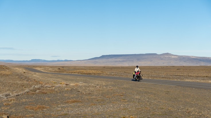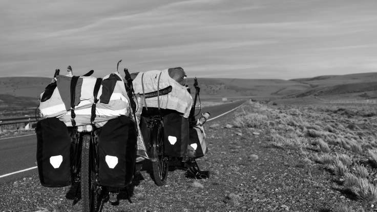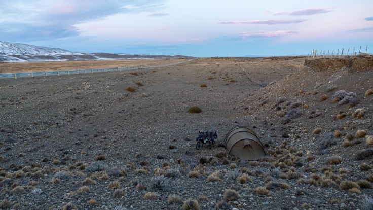 Lorsque la roue avant du Panzer fait des siennes, bizarrement nous n’avons aucun passage. Le pneu avant est déjà mort. Il a été remplacé à Rio Mayo, à 700km. Il n’a pas fait long feu. Il est ouvert et a percé la chambre à air. Celle-là, il faut la changer. Quant au pneu, une réparation approximative avec un stick, collé à l’intérieur est à l’essai. Nous verrons si cela peut tenir les 60km qui nous séparent de El Chalten. Mais si un pick-up a la bonne idée de demander si tout va bien, nous emprunterions bien l’arrière pour y mettre nos vélos. Seulement, forcément, quand on le veut, cela n’arrive pas. Des voitures passent, une s’arrête à nos gestes, mais elle ne sera pas assez grande pour que nous tenions tous… Dommage. Alors continue le pédalage pendant que le soleil descend dans le ciel, et se cache derrière les nuages. L’heure tourne et seulement 32km de roulé! Il nous manque un rien, mais à 16h, la motivation (et les forces) est moindre. On tente encore un peu persuadé que le vent a faibli. Illusion d’un virage, d’un instant. Une estancia de dépassée, quelques coups de pédale pour presque terminer cette ligne droite, et l’on cherche l’endroit du bivouac, au grand soulagement de Raphaël qui aurait aimé arriver dès ce soir à El Chalten.