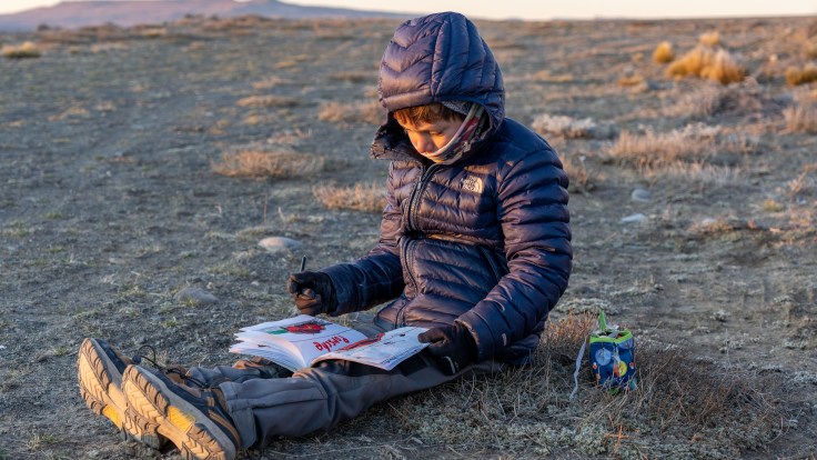 A l’abri d’un talus à gauche d’une côte, en suivant un guanaco qui nous évite, nous trouvons notre bonheur du soir. Le lieu est déjà à l’ombre, les enfants continuent à jouer avec leur os et nous montons la tente en enlevant les pierres les plus grosses… tous à l’intérieur à 17h30, protégés du vent et bien plus au chaud. Les loulous dessinent pendant que nous cuisinons le repas, déjà presque préparé: un couscous maison avec de la semoule et les légumes de la soupe de Tres Lagos. Un régal pour les papilles. Nous partageons notre dîner encore quelques minutes avant que la fatigue et la nuit nous prennent.