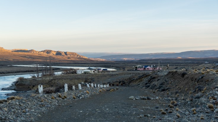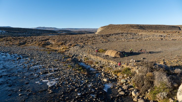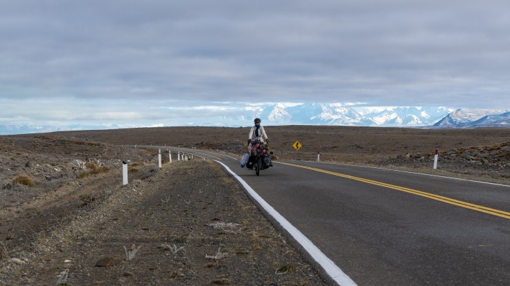 Évidemment, ce n’est qu’à 10h30, avec des températures encore négatives que nous démarrons notre route 23 du jour. Les nuages ont pris d’assaut le ciel, ne laissant rien entrevoir de la cordillère derrière nous ou des collines sur notre gauche. Le lac se voit et nous le longeons, remontons sur le plateau en s’en éloignant, en passant devant notre aire de pique nique de l’Aller. On peut dire que l’on connaît le coin, comme notre 1er bivouac sur cette portion, 17km plus loin. C’est d’ailleurs juste 1000m avant celui-ci que nous pique-niquons derrière un petit talus à l’abri du peu de vent qu’il y a, mais qui nous refroidit les doigts auxquels on a enlevé les gants pour préparer notre repas. Sylvain part à la chasse au bois sec, plutôt aux plantes/ buissons secs pour se faire un feu! Et c’est de bonne augure. On va côté cuisine près de la sacoche de nourriture pour cuisiner chacun notre sandwich et on file côté salon pour le bon feu. Mais, cela a un revers: on met 1h pour manger, remettant encore et encore, encore un petit peu encore, des branches. On alimente le feu, on alimente notre corps ainsi! 14h, c’est l’heure d’aller pédaler.