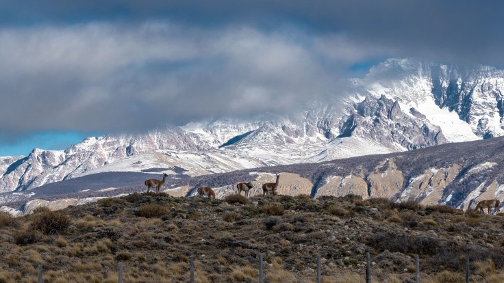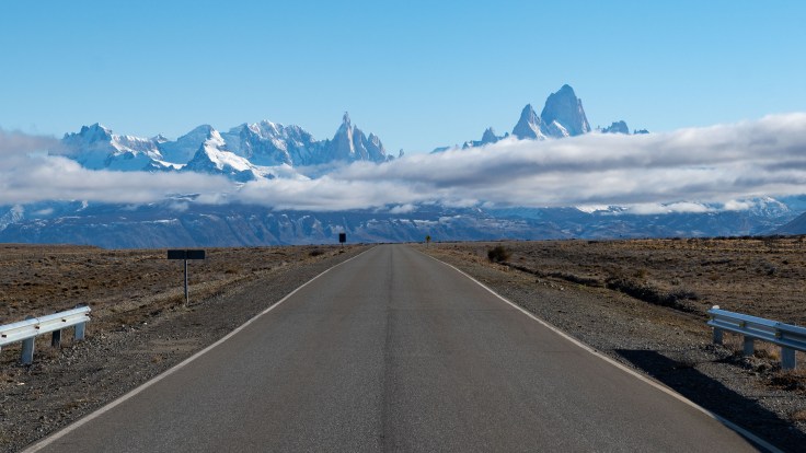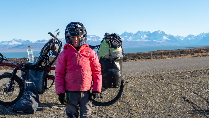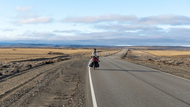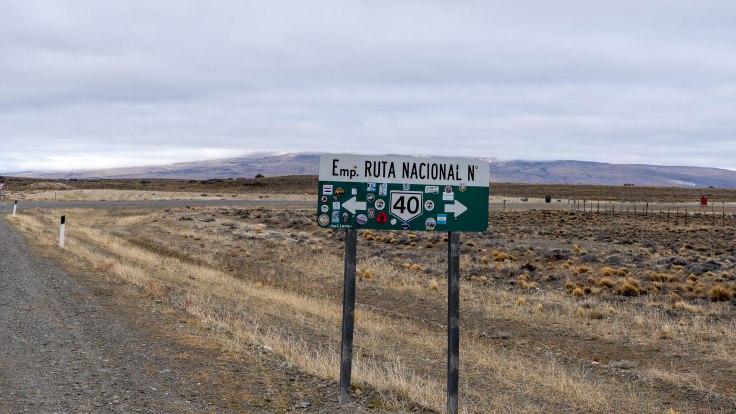 Les montagnes deviennent des collines qui se rapetissent à mesure que nous filons vers la route 40. Les guanacos sont toujours autour de nous par centaines, et la nature nous réjouit, comme lorsqu’un guanaco adulte traverse la route juste devant le Couillot, et saute par-dessus la clôture pour rejoindre son petit. Raphaël s’exclame alors: « il y a des choses joyeuses quand même [les familles se rejoignent] ». J’adore! Alors, on pédale parmi ce spectacle des familles animalières, nous une famille humaine, une famille pédalière. On avance plutôt bien et nous retrouvons à l’intersection avec notre bonne vieille route 40! Ça fait drôle de la retrouver, comme si on retrouvait une copine, comme si elle nous avait manqué, comme si on la connaissait bien! Les nuages sur la Cordillère se sont levés et laissent le Fitz Roy et le Cerro Torre nous dire au revoir. Un salut qui nous réchauffe parmi le froid patagonien.