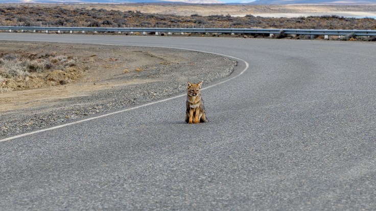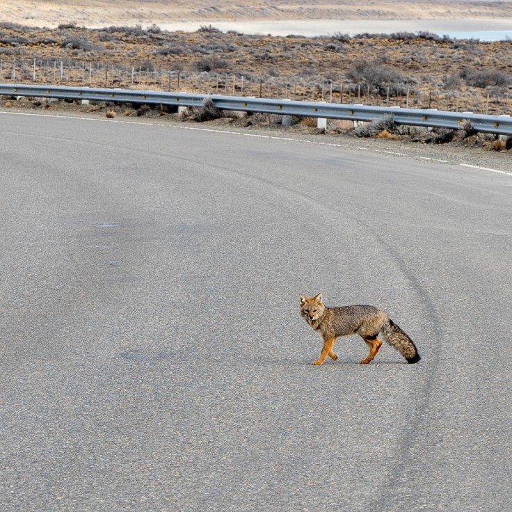 Nous nous sommes fixés un bivouac à 38km de notre pique-nique, ce qui signifie d’où nous sommes maintenant, 32km restant. On finira tard aujourd’hui mais au cas où, il y a un spot 12km auparavant près d’une rivière. Que de choix! En selle, nous ne croisons à nouveau pas grand monde même sur cette portion, c’est étonnant. Un seul bus de retour d’El Chalten, parmi tout ceux vus le matin, et quelques voitures, tout sourire. Nous admirons le lac Viedma sur sa largeur, oscillons entre légère côte et légère descente, laissons passer les guanacos, retrouvons des nandous qui s’enfuient, et tombons sur une petite surprise: un renard. Alors, en vérité, un premier renard gris a traversé la route pour entrer sur un champ. Mais le second, fut une belle rencontre. Lors de notre arrêt sur le mirador (lac + Cordillère), il est arrivé du talus en face et se dirigeait vers le parking et les poubelles. Il s’est assis en plein milieu de la route sans crainte, a regardé des deux côtés comme pour vérifier la venue d’un véhicule (ses parents l’ont bien élevé!), s’est étiré le dos en bayant, s’est assis et nous a observés. Quelle rencontre avec lui! Nous étions tous les 4 sous son charme. Photo et vidéo étaient nécessaires pour immortaliser ce moment comique. Nous l’avons quitté ici, sur son talus de sable pour continuer notre route.