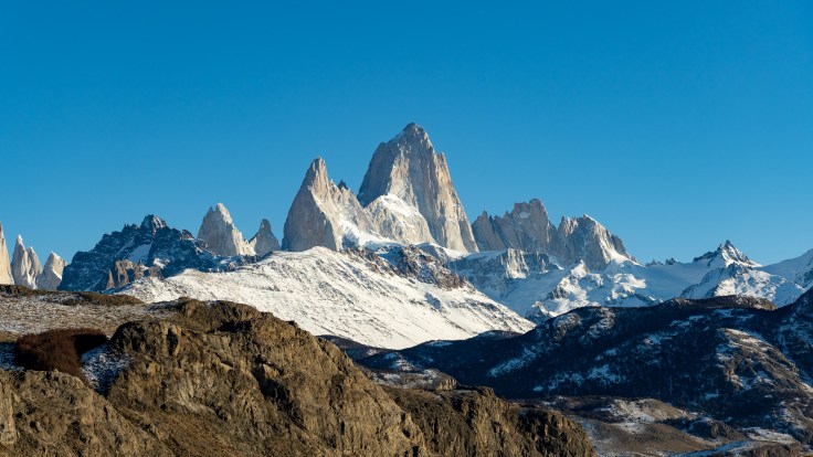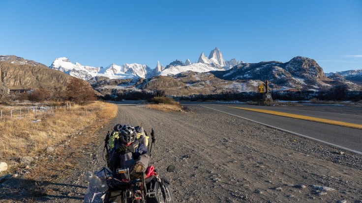 Reprenons à ce matin. Nous nous levons à nos heures habituelles, 8h, pour petit-déjeuner tous ensembles à table, rassembler nos affaires et les ranger dans les sacoches. Nous sommes dans nos temps, mais nous allons en perdre lors du paiement de nos nuitées. Ce n’est que vers 11h, que nous sortons du village accompagné du soleil et du ciel bleu, du Fitz Roy et du Cerro Torre, alors que tout est calme dans les rues.