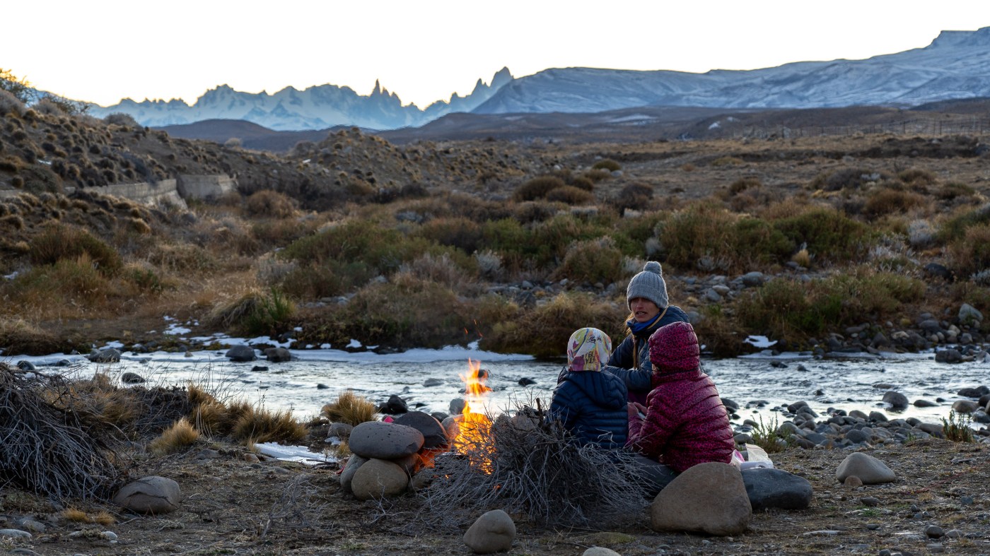 Ce soir, assise sur un gros cailloux, le ring devant moi, l’eau en ébullition dans la casserole avec le feu dessous, j’écris. Il est 17h40 lorsque je commence et le soleil se couche derrière le Fitz Roy que nous apercevons encore. Cela fait déjà 1h30 que nous ne nous occupons plus des enfants, partis jouer près et dans la rivière à côté, avec les plaques de glace. Mais comme dis Emma, « la glace c’est glaciale »! Bah oui!
