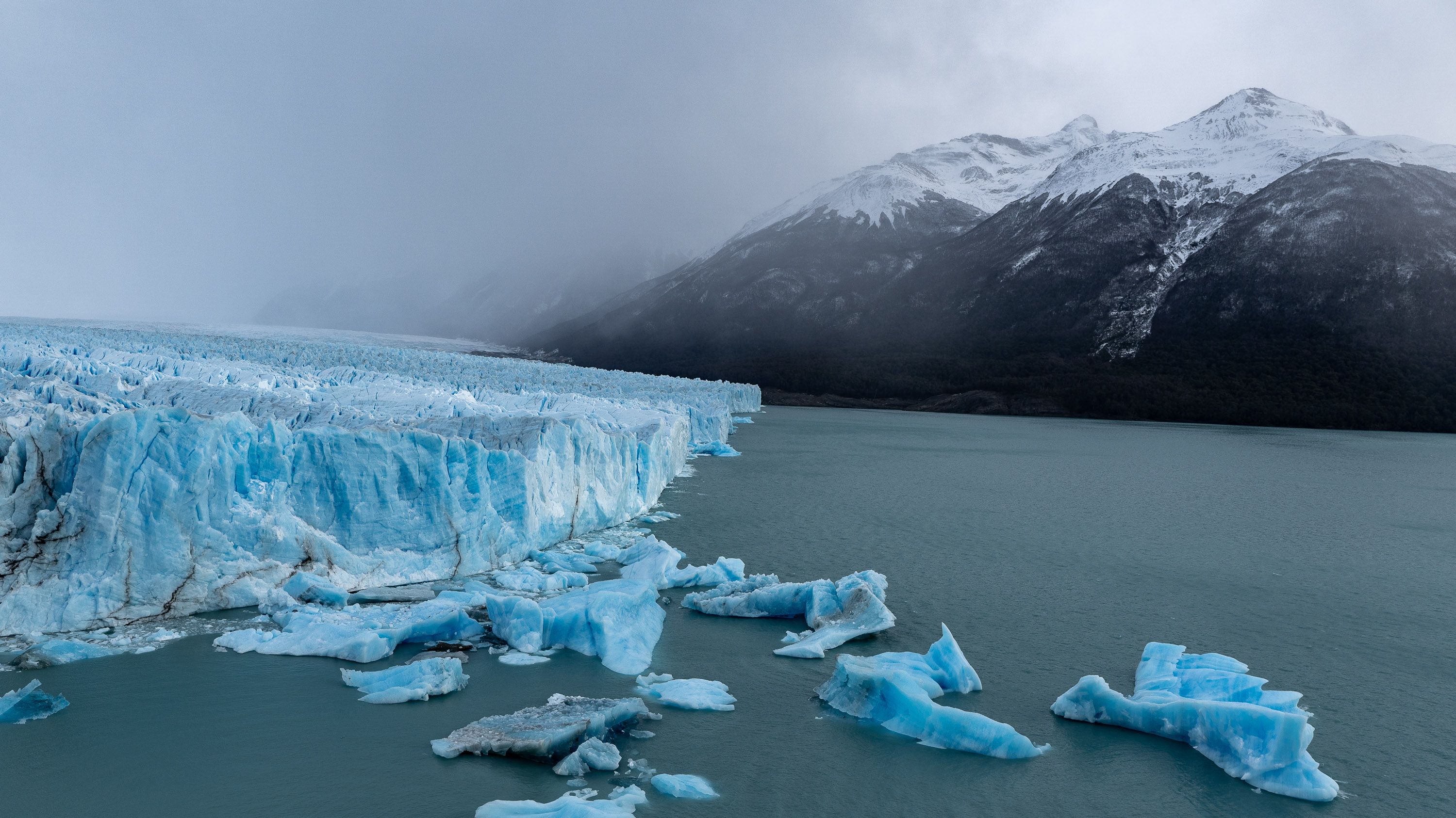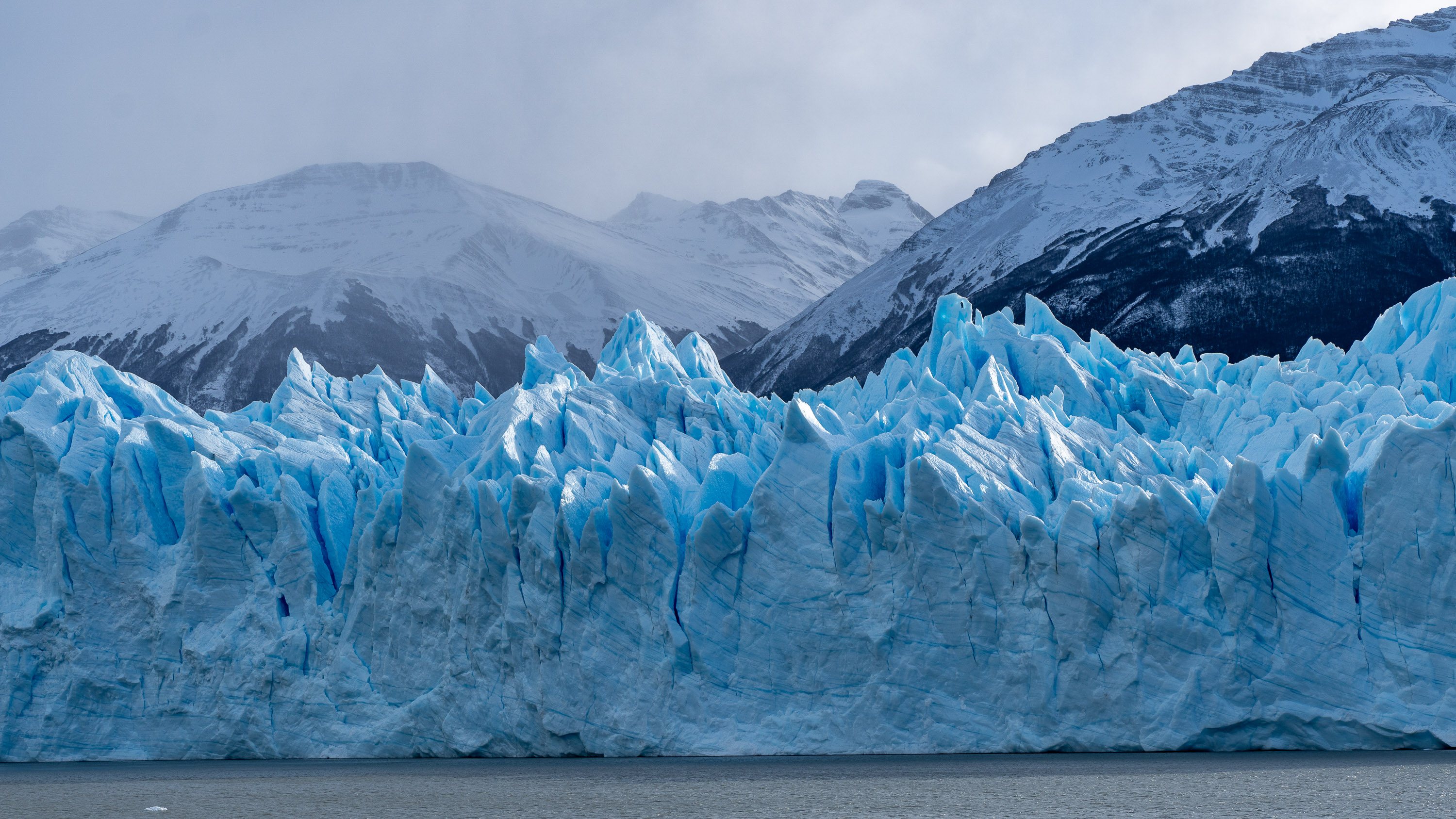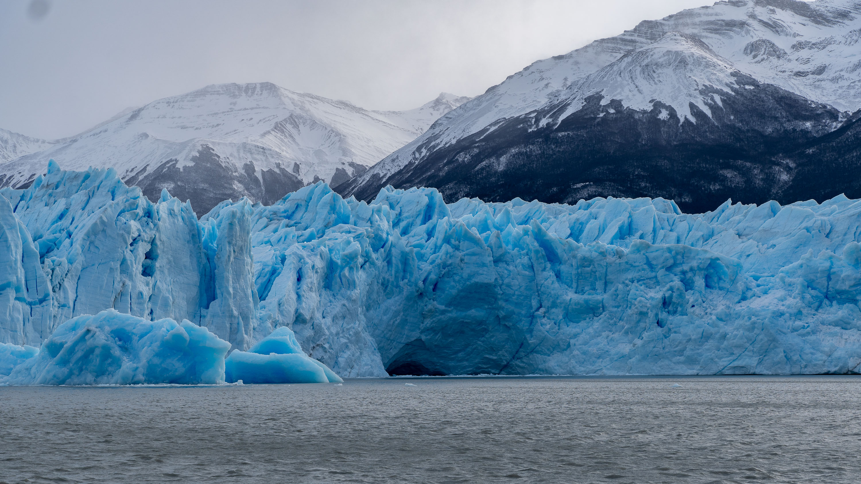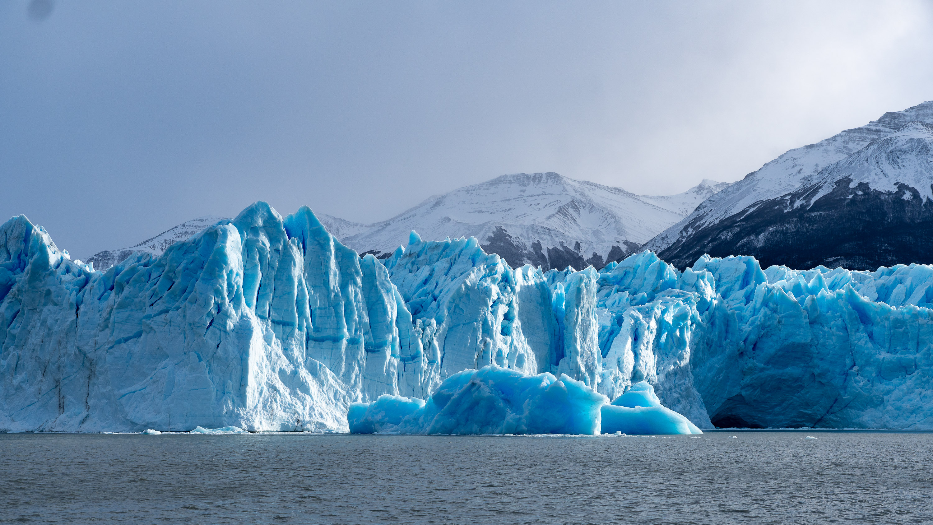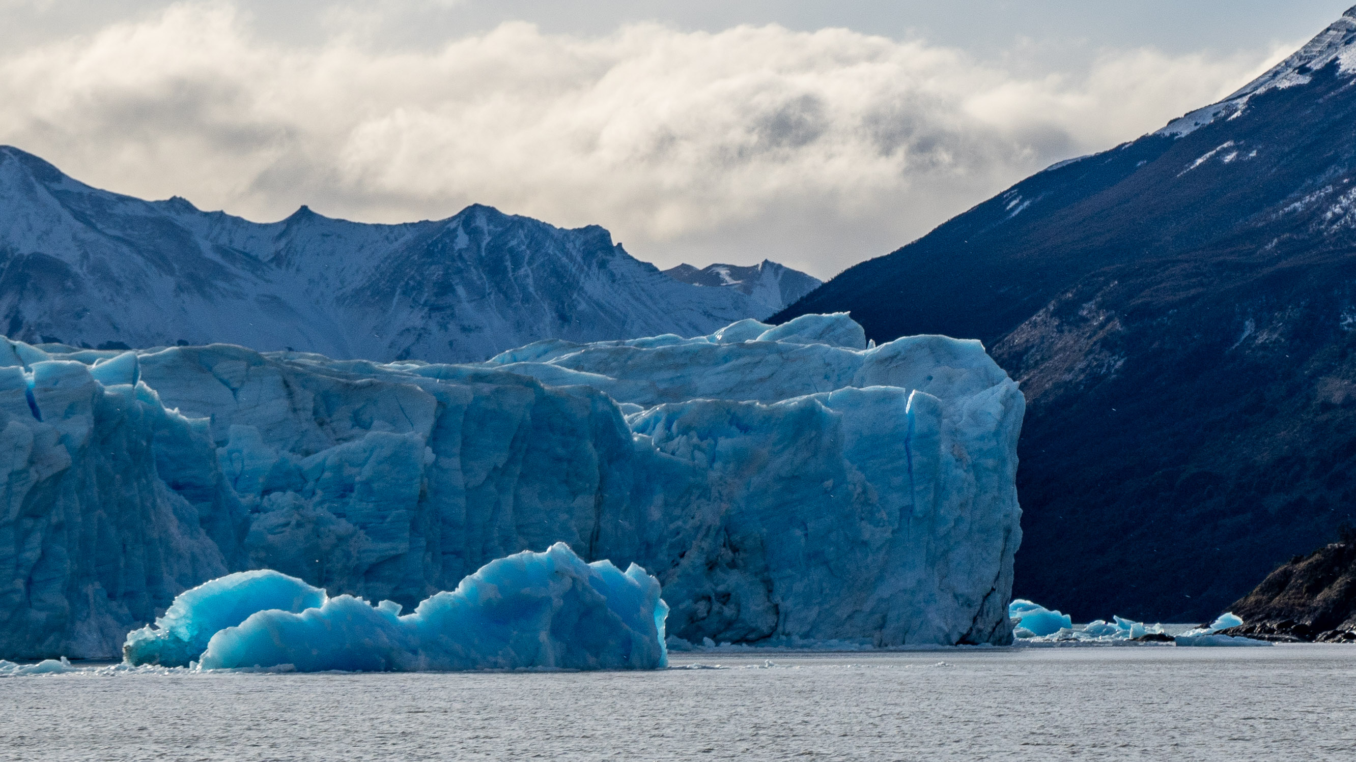 Ce glacier est situé dans le « Parc National Los Glaciares », qui concentre la plupart des énormes glaciers de la Patagonie. Le Perito Moreno, avec ses 250 km², arrive seulement sur la 3ème marche du podium en terme de dimensions, et c’est pourtant déjà un monstre. C’est en revanche le plus accessible, puisqu’il est possible de s’y rendre par la route, contrairement à tous les autres du parc. Il est donc le plus visité et dispose d’aménagements, notamment des passerelles piétonnes pour pouvoir l’admirer au plus près. Depuis ces passerelles, on peut contempler ce glacier, et guetter les chutes de blocs de glace qui ont lieu régulièrement et fréquemment à mesure que le glacier avance et bute contre les rochers dessous. La partie émergée de glace s’élève entre 60 et 70 m au dessus du lac, soit un immeuble de 17 étages environ… mais il y a aussi une centaine de mètres sous la surface de l’eau. C’est impressionnant !