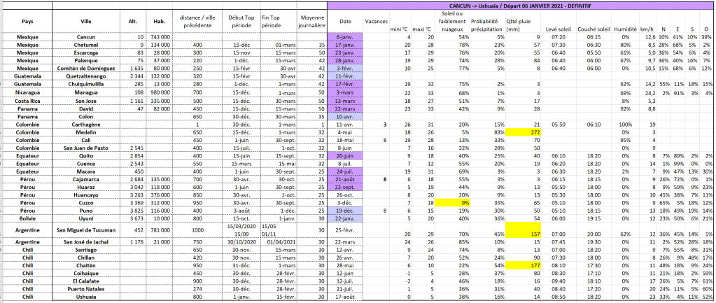 Dès lors que nous avons pris la décision de repartir aussi tôt que possible, nous avons étudié plusieurs solutions. Y compris un départ depuis le Chili pour remonter vers le Mexique. Mais le départ depuis le Sud pour aller vers le Nord a été écarté principalement en raison des vents dominants Nord->Sud marqués sur certaines portions en Amérique du Sud.